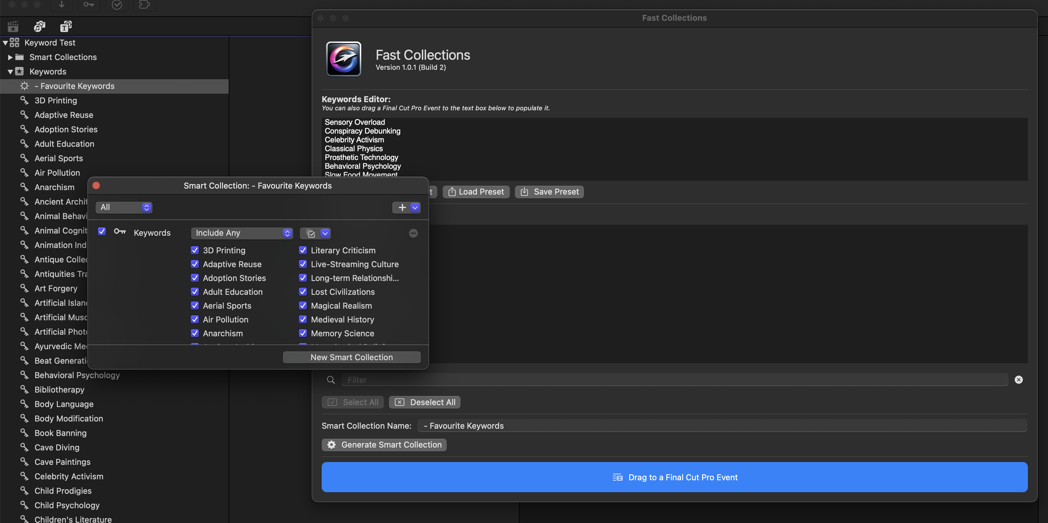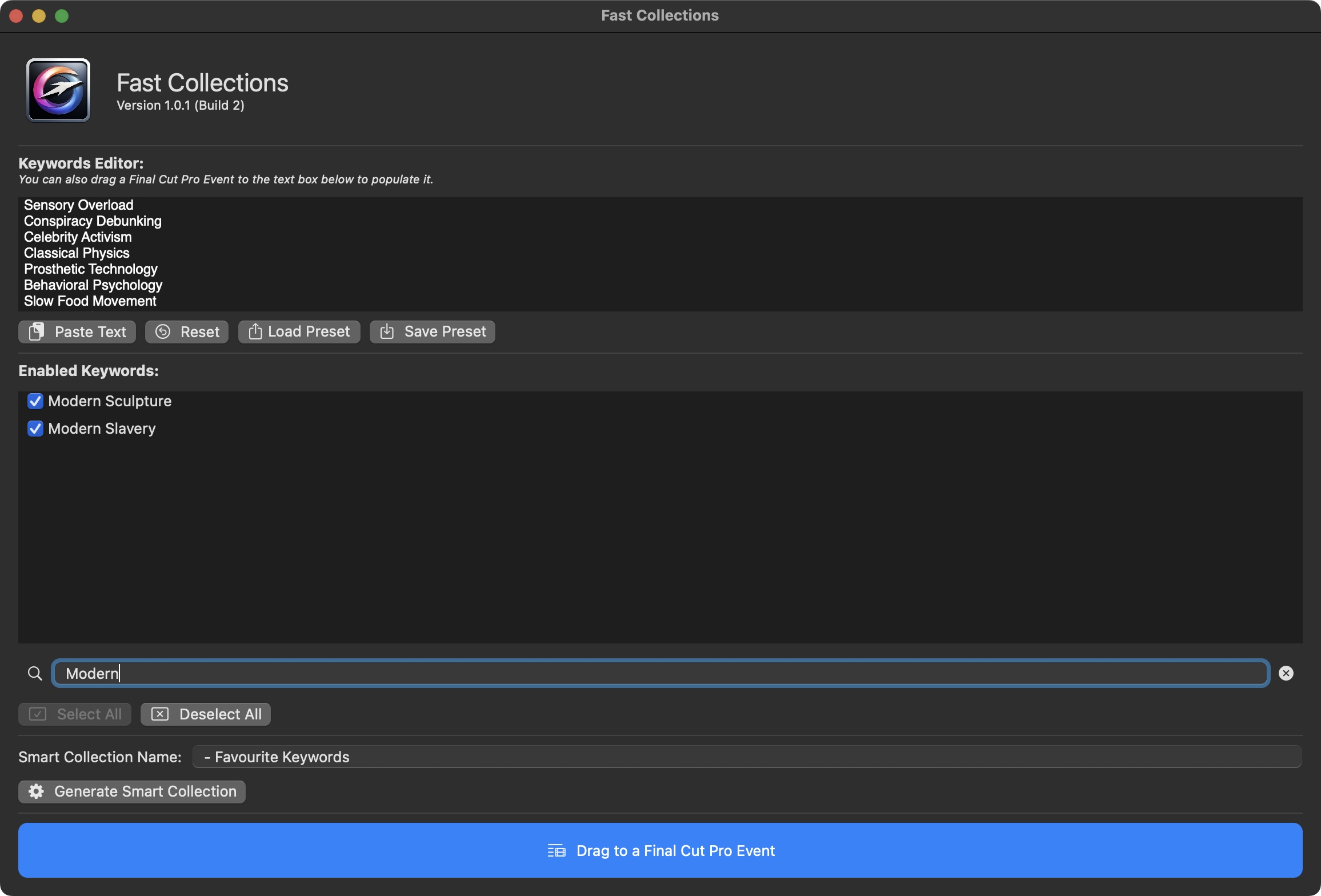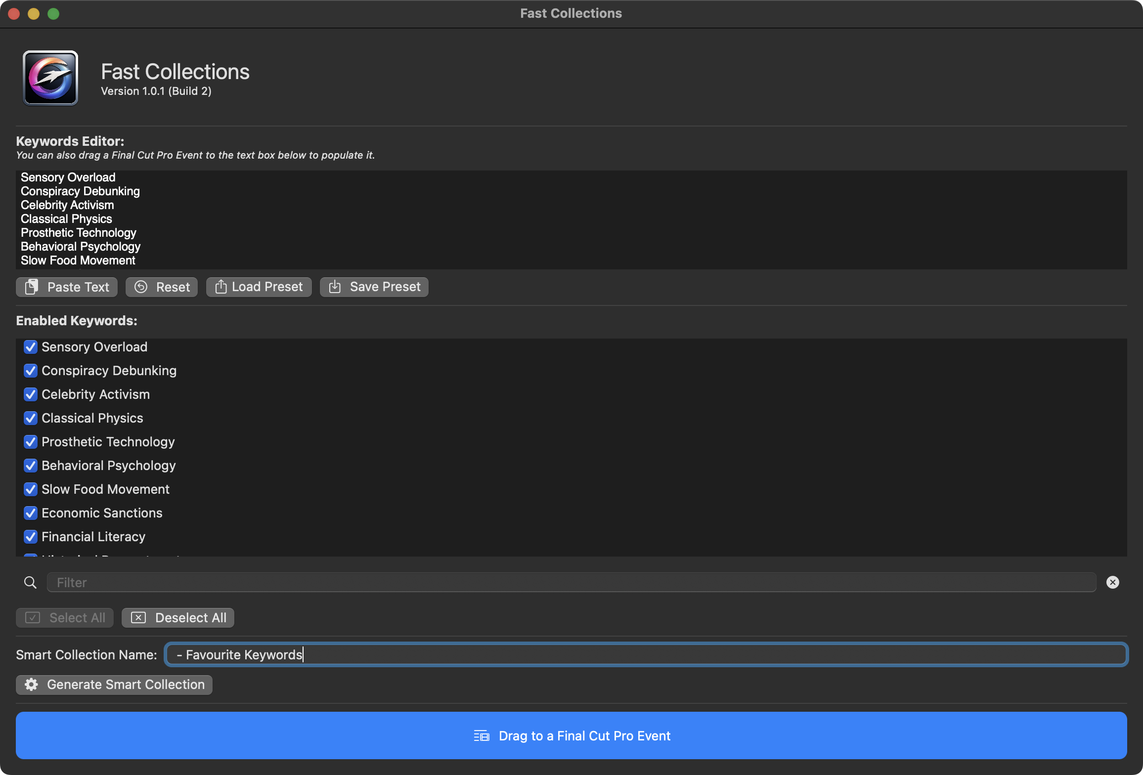 Alternatively, you can also drag a Final Cut Pro Library or Event from the Final Cut Pro Browser to the Keywords Editor text box, and all the keywords in that library or event will be populated.